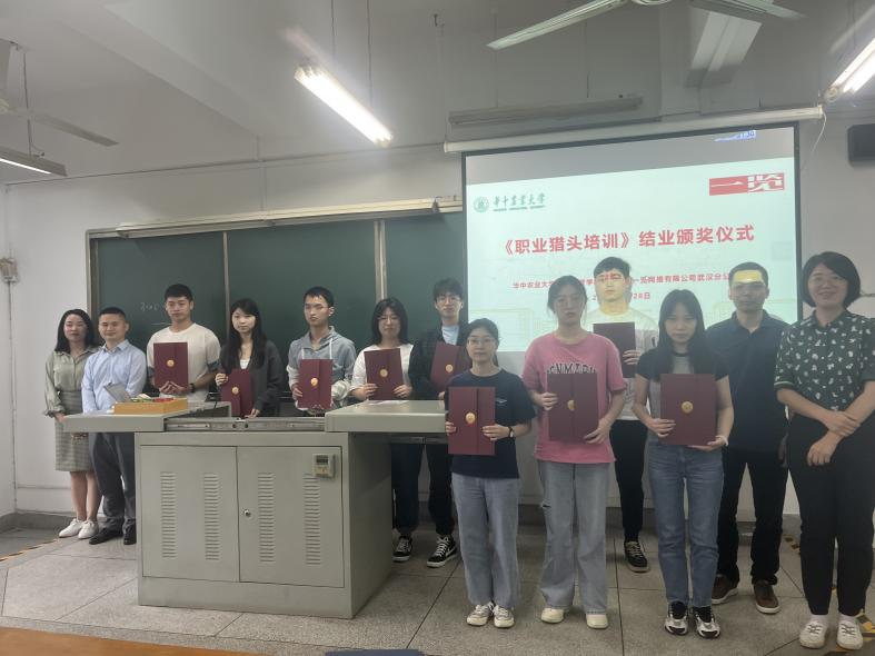 历时2个月,由4名beat365中文唯一官网人力专业教师、8名一览武汉市分公司管理人员齐心打造的创新创业课程《职业猎头实训》圆满结束。2022年5月28日下午,课程结业颁奖仪式在二教202举行。beat365中文唯一官网副院长罗小锋、课程组负责人施丹、一览武汉分公司总经理姚小山、经理胡甜出席,27名参课同学参加了颁奖仪式。