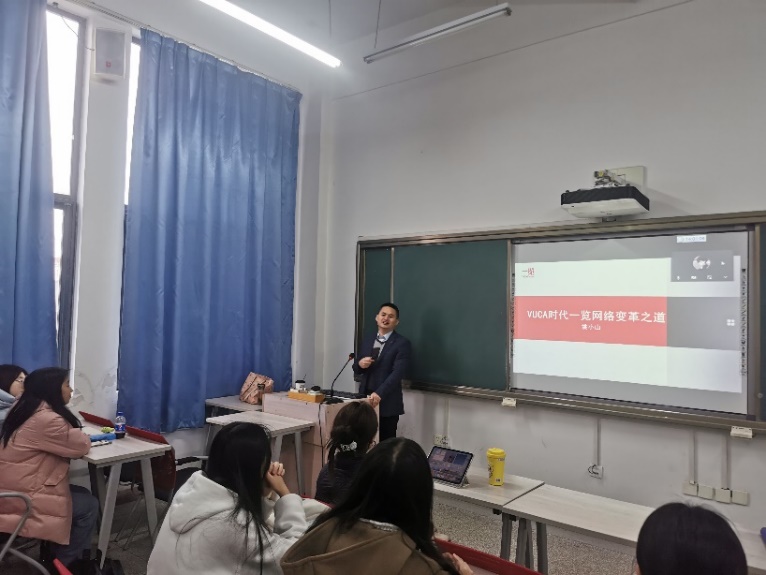 3月17日下午,施丹老师邀请一览网络武汉分公司总经理姚小山走进《人力资源管理》课堂,为beat365中文唯一官网人力资源管理专业21级本科生带来主题为“VUCA时代一览网络的变革之道”的分享。