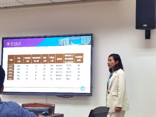 在专业与核心课程的自评报告中,会计学系主任包晓岚进行了专业汇报,为大家介绍了会计学系师资力量及优秀学生成果,并提出课程改革的主要举措是将“思政红色”、“智慧亮色”与“会计本色”结合。在核心课程汇报中,老师们分别对5门专业核心课程《会计学(Ⅱ)》、《审计学》、《高级财务会计》、《成本与管理会计》与《会计大数据基础》的建设情况进行了报告,分析了现存问题与困境,并提出未来改革发展方向。