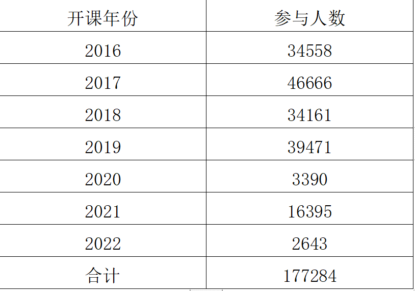 2.2016年开课以来,课程年均参与人数超过2万人,共计17.7万人加入课程学习,产生了较大的社会影响。