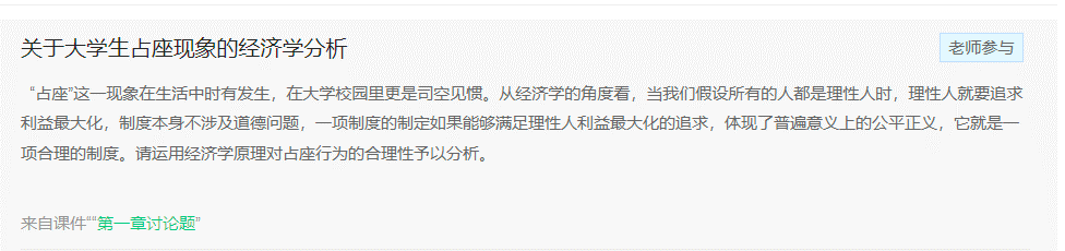 4.个体学习与群体互动相结合。通过设置讨论题的方式,引导学生对一些具有争议的现实问题进行思考和讨论。例如,针对大学生群体中经常出现的占座现象,设置思考讨论题,引导学生运用经济学原理进行思考和解释。