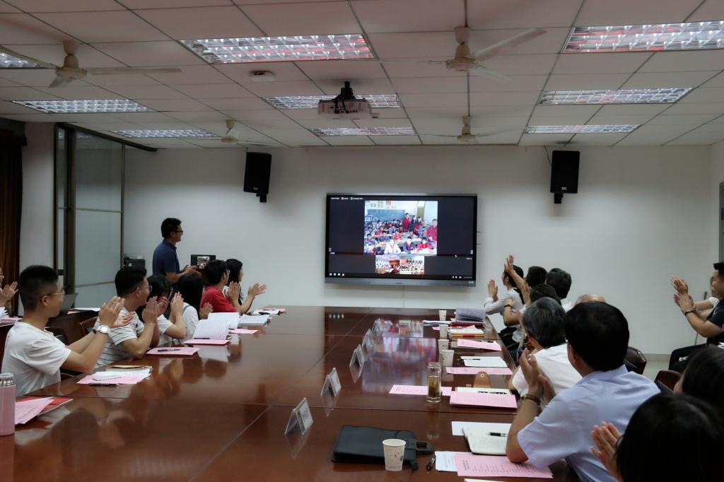 活动现场,党支部还视频连线了湖北恩施摩峰小学和贵州毕节华农大石希望小学研究生支教团党支部党小组。支教老师们分享了他们在支教地开展“我和我的祖国”活动的情况。大石希望小学的支教团队员王庆鲁在视频中介绍道,为厚植学生的爱国主义情怀,将学生培养为有理想信念的社会主义建设者和接班人,我们开展了“为中华复兴而读书”开学第一课、“童声告白祖国”《我和我的祖国》歌唱活动、“童画告白祖国”给祖国妈妈的一幅画、“童言告白祖国”给祖国妈妈的一封信、“壮丽七十载,奋斗新时代”国庆主题班会和主题升旗仪式等活动,与孩子们共同庆祝中华人民共和国成立70周年。