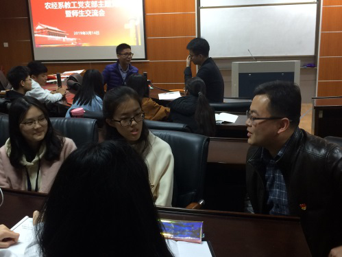 (3)3月14号下午的七八节课,我们来到了人文楼M502,开展党建交流会。我们分小组与农林经济管理系的教授们进行交谈,获益良多,如沐春风。我们小组与亲切的郑炎成教授进行了深入交谈。他得知我们初入大学还有很多疑惑,为我们解答了许多关于专业和大学生活的问题。他以自己的经验向我们总结了什么是经济学,农经又该怎么学好,他的见解充分体现了一个老者的智慧。同学们还问了许多关于保研、出国、就业方向等问题,郑教授一一为我们答疑释惑,解决了上大学以来的许多困惑。我们一致认为这是一个对我们明确大学生活方向极其有益的活动。