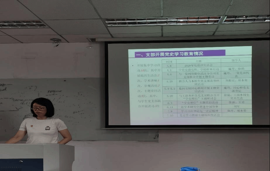 活动伊始,党支部书记施丹向大家汇报支部半年来开展党史学习教育情况,支部共举办集中学习活动10次,其中,组织生活会2次、学术讲座1次、参观考察2次、主题党日活动5次,为了增进师生交流,与学生党支部联合开展活动3次。围绕学党史、悟思想、办实事、开新局主题,依托2020年立项的校级党建工作对标争先项目,支部开展了形式多样、内容丰富的学习活动,通过走出去与引进来相结合的方式,不断丰富党史学习教育形式;邀请中国人民大学刘军老师讲授如何讲好中国故事,拓展党员教师科研视野;支部还充分发挥党员先锋模范作用,助力枝江市问安镇同心桥村美丽乡村建设。但是,支部党建活动也存在一些不足,如学习活动的纪律性有待加强,学习形式和服务师生方式有待进一步创新,学习效果有待进一步保障。这都是下半年党建工作亟需改进的地方。