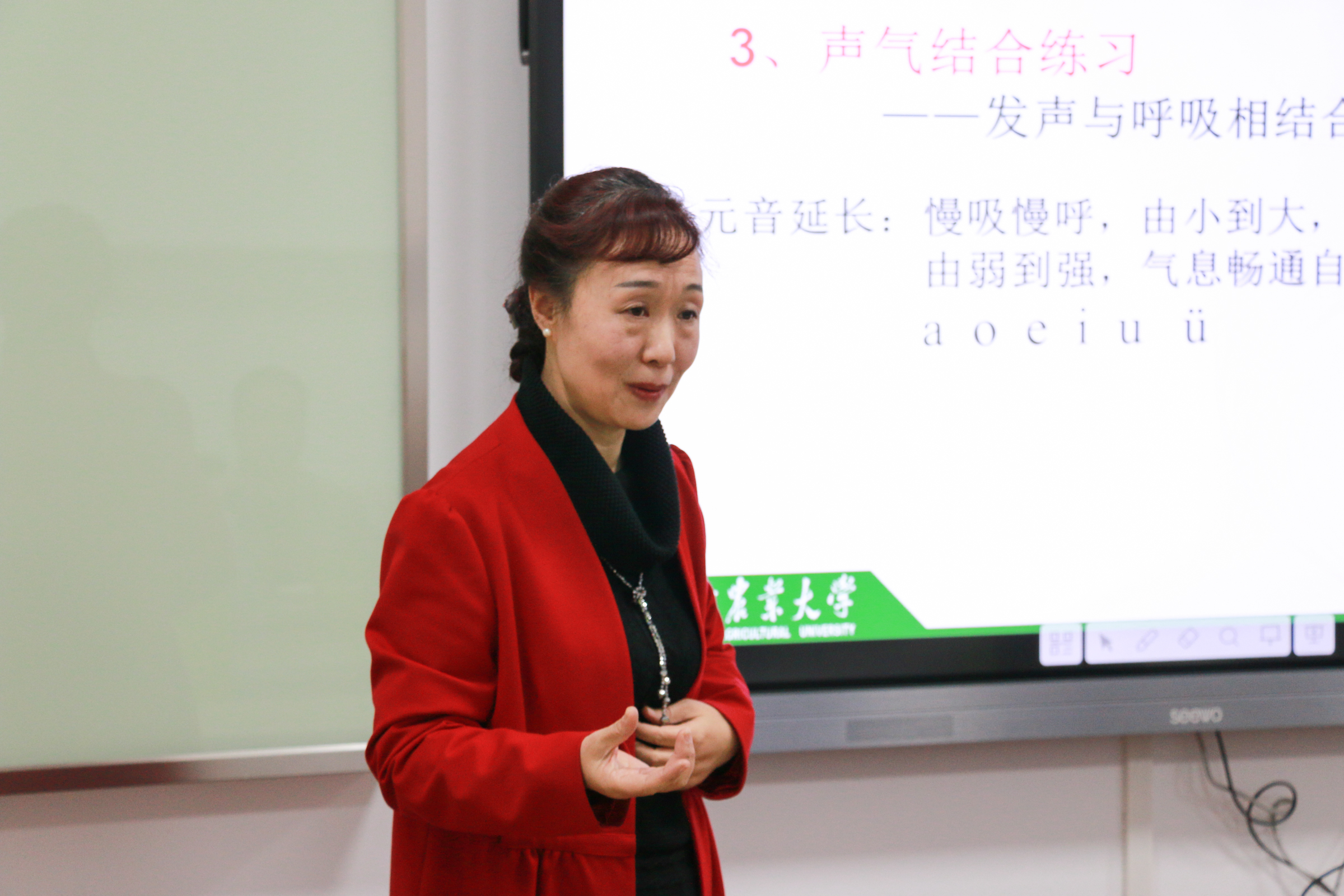 “有声语言分为自然语言与艺术语言,而课堂授课是一种特别的艺术语言。”兰霞说道。在范围广、时间长、人数多的课堂教学中,老师们长时间授课,嗓子很容易嘶哑。很多老师因为学生数量多而更加用力发声,往往使嗓子受损更大,但如果老师们能够熟练应用口语发声技巧,即得体的态势语,准确的书面语,就可以使用声达到最佳效果,能让发音准确而清晰,嗓音持久而圆润,也可以让学生听课感受更加愉悦。与此同时,她还提到“借鉴民间说唱和声乐方法,发声和唱歌二者互补,能让声音变持久变悦耳。