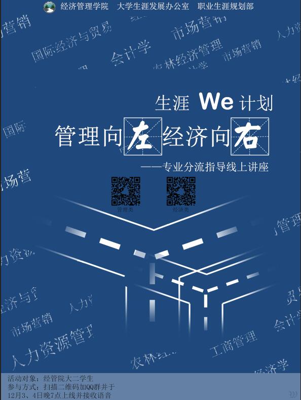 活动负责人孙春萌表示,依托生涯WE计划系列活动,近期还将配合学院制作各专业近三年相关数据分析材料,对各专业考研率、出国率、考研出国学校分布、就业方向、就业地域及工薪分布等情况进行介绍,为经管院学生的专业选择提供全方位的信息,帮助同学们更好地“职行现在,规划未来”。