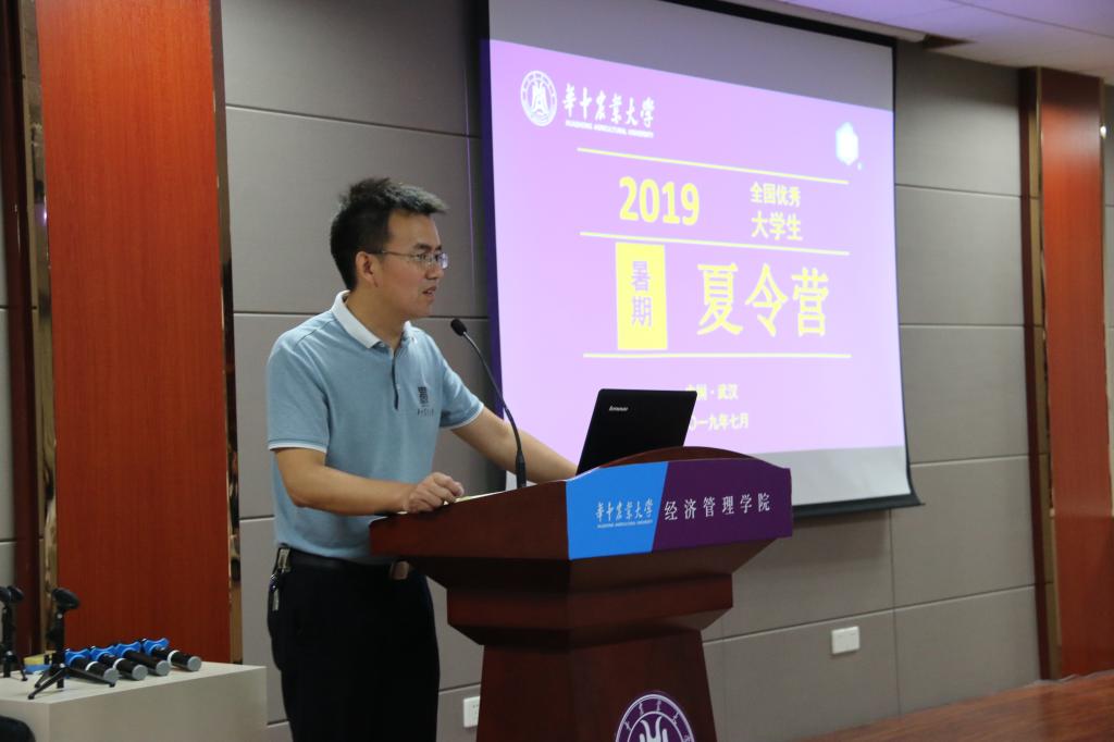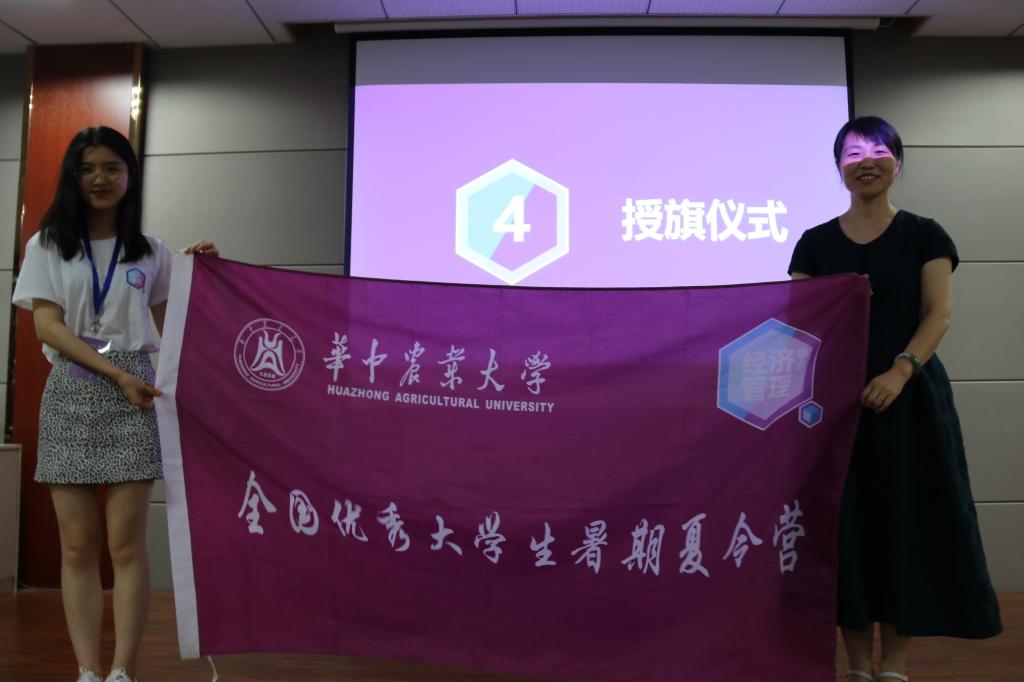 7月10日20:00在人文楼M412,暑期夏令营开营仪式在雄壮的国歌声中拉开帷幕。院党委书记陈国顺、副院长李谷成、于久霞参加开营仪式,院党委副书记刘三宝主持仪式。副院长李谷成教授代表学院介绍了学校、学院的相关情况,并再次向所有营员发出了邀请。王安邦同学作为营员代表分享了自己三年来在华农的学习、生活和工作经历,表达了对这片沃土的热爱之情。分享结束后,副院长于久霞向营员代表授旗。最后,院党委书记陈国顺致欢迎词并宣布开营,他首先对学院的历史沿革、学科的发展现状进行了详细地总结介绍,并真切地谈到:“我们真诚地期待大家加盟beat365中文唯一官网,期望大家能够结识新朋友,碰撞新思想,做出正确的选择。我宣布,2019年暑期夏令营正式开营!”