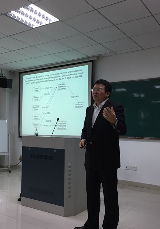 11月18日下午第141期达尊讲坛在人文楼M507如期举行,今日特邀嘉宾是浙江大学管理学院的霍宝锋教授。霍教授主要研究运营管理、物流与供应链管理及实证研究方法。本次讲座主题:1.供应链管理:跨学科视角2:如何发表高水平学术论文?很多同学都是慕名而来,全场座无缺席。霍老师以对南湖的喜爱,对水的亲近开始本次讲座,他幽默地说,在他心里最好的市场营销大学是美国的西北大学,因为那里的湖很美。接着霍老师从研究背景,研究领域,关系管理与供应链整合研究框架,来介绍供应链管理。在经济全球化,中国制造2025,“一带一路”等研究背景下,运用利丰集团,苹果iPhone在全球的供应链整合来解释经济全球化背景下的分工协作,降低物流成本。在研究领域,从供应链整合到供应链管理再到运营管理,范围横跨社会学,政治学,经济学,管理学等多个学科。霍老师还和同学们分享自己多年积累的经验成果,从跨学科研究之多视角看问题,跨学科研究之研究设计,跨学科研究之论文发表,跨学科研究之团队合作等方面给同学们全面讲述供应链管理的内容。随后霍老师从信息共享,人力资源,企业文化,法律环境,政治因素等方面介绍与供应链整合,并以华为为例。华为在供应链整合方面做的比较好,先让供应商盈利,退一步自身少赚点,可以更好的让供应商为华为服务。
