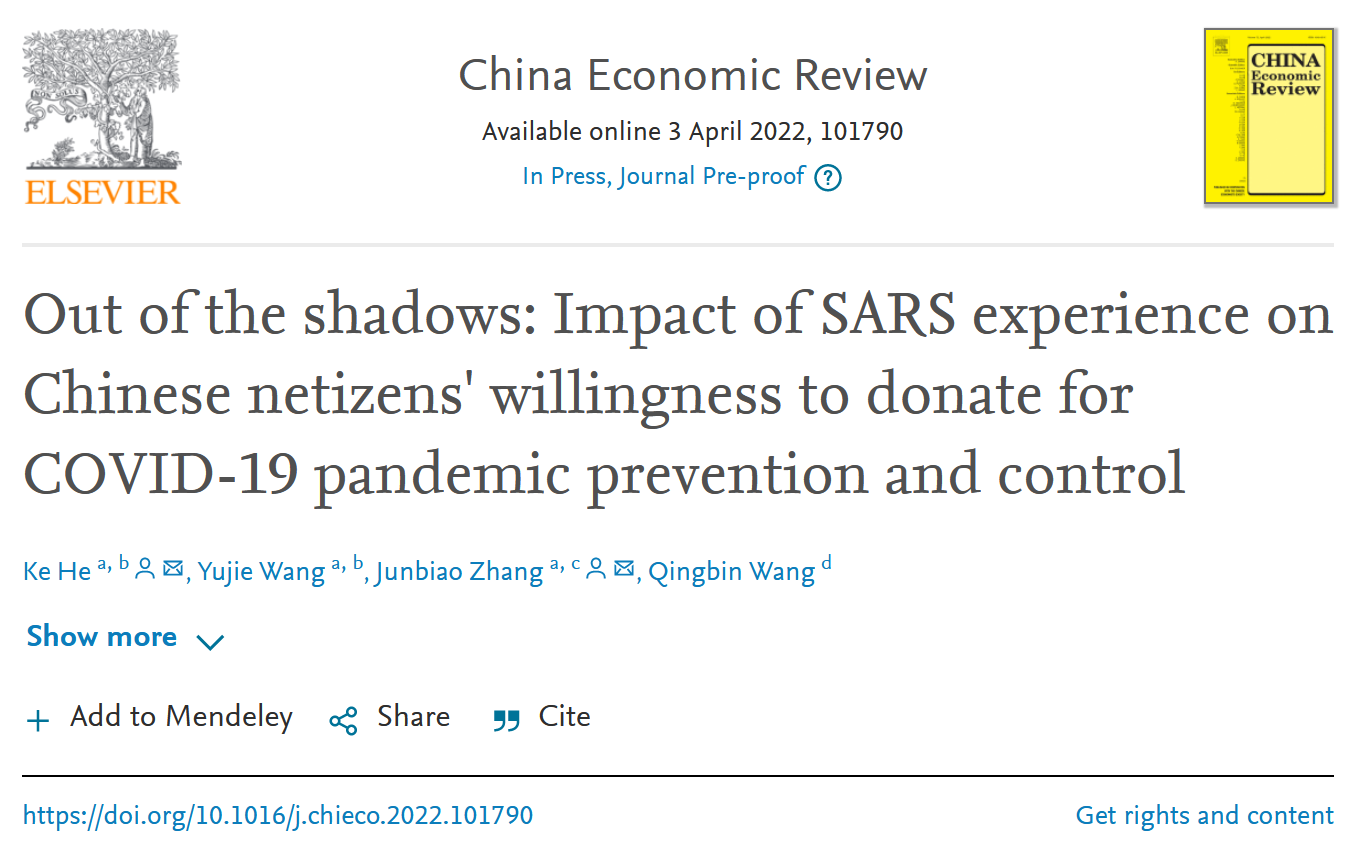 此外,面对新冠肺炎疫情对经济社会的巨大冲击,农业资源与环境经济团队积极以笔代戎助力社会战“疫”。围绕新冠肺炎疫情的影响,何可副教授主笔撰写的题为“Out of the shadows: Impact of SARS experience on Chinese netizens’ willingness to donate for COVID-19 pandemic prevention and control”的研究论文在经济学国际知名期刊China Economic Review在线发表。