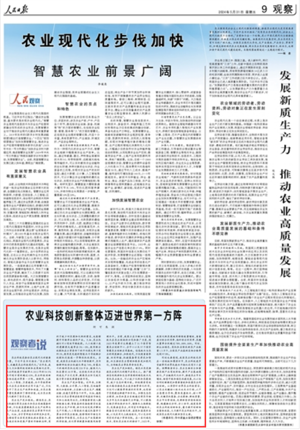 核心提示: 5月31日,《人民日报》09版报道了beat365官网何可、朱润题为《农业科技创新整体迈进世界第一方阵》的文章,文章阐述了beat365官网学者对我国农业科技创新整体迈进世界第一方阵的思考。