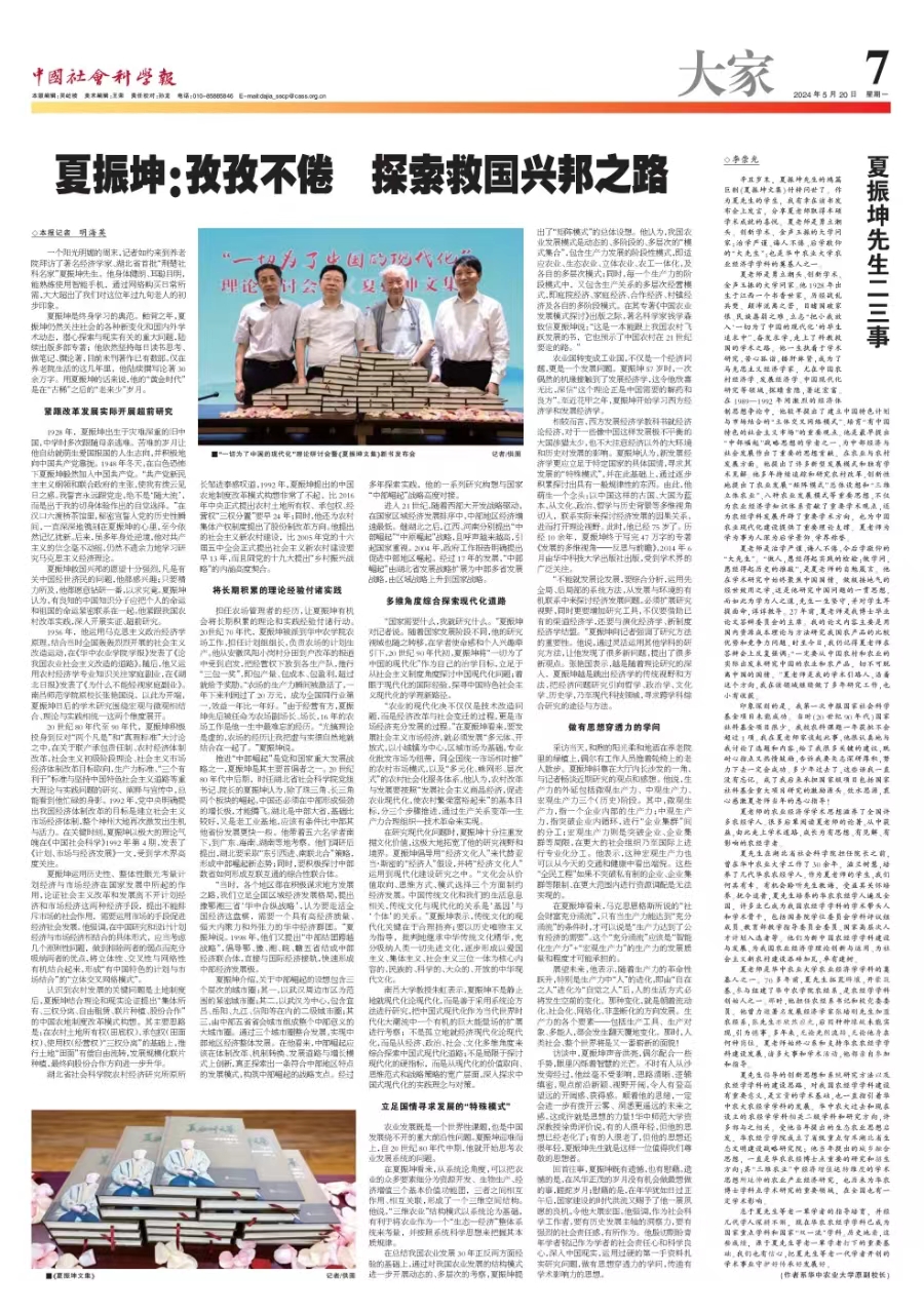 夏老师是勇立潮头、创新学术、金声玉振的大学问家。他1928年出生于江西一个书香世家,历经战乱兵燹、颠沛流离之苦,目睹国破家恨、民族孱弱之难,立志“把小我放入‘一切为了中国的现代化’的毕生追求中”,奋发求学,走上了科教救国的学术之路。他一生执着于学术研究,苦心孤诣,镂肝鉥肾,成为了马克思主义经济学家,尤在中国农村经济学、发展经济学、中国现代化研究等领域,探赜索隐,著述宏富。在1989—1992年间激烈的经济体制思想争论中,他较早提出了建立中国特色计划与市场结合的“立体交叉网络模式”、培育“有中国特色的社会主义市场”的重要观点。他是最早提出“中部崛起”战略思想的学者之一,为中部经济与社会发展作出了重要的思想贡献。在农业与农村发展方面,他提出了许多新型发展模式和独有学术见解。他多年持续追踪和研究农村改革,创新性地提出了农业发展“矩阵模式”总体设想和“三维立体农业”、八种农业发展模式等重要思想,不仅为农业经济学知识体系贡献了重要学术观点,还为农经学科发展开辟了重要学术方向,也为中国农业现代化建设提供了重要理论支撑。夏老师为学为事为人深为后学景仰、学界称誉。