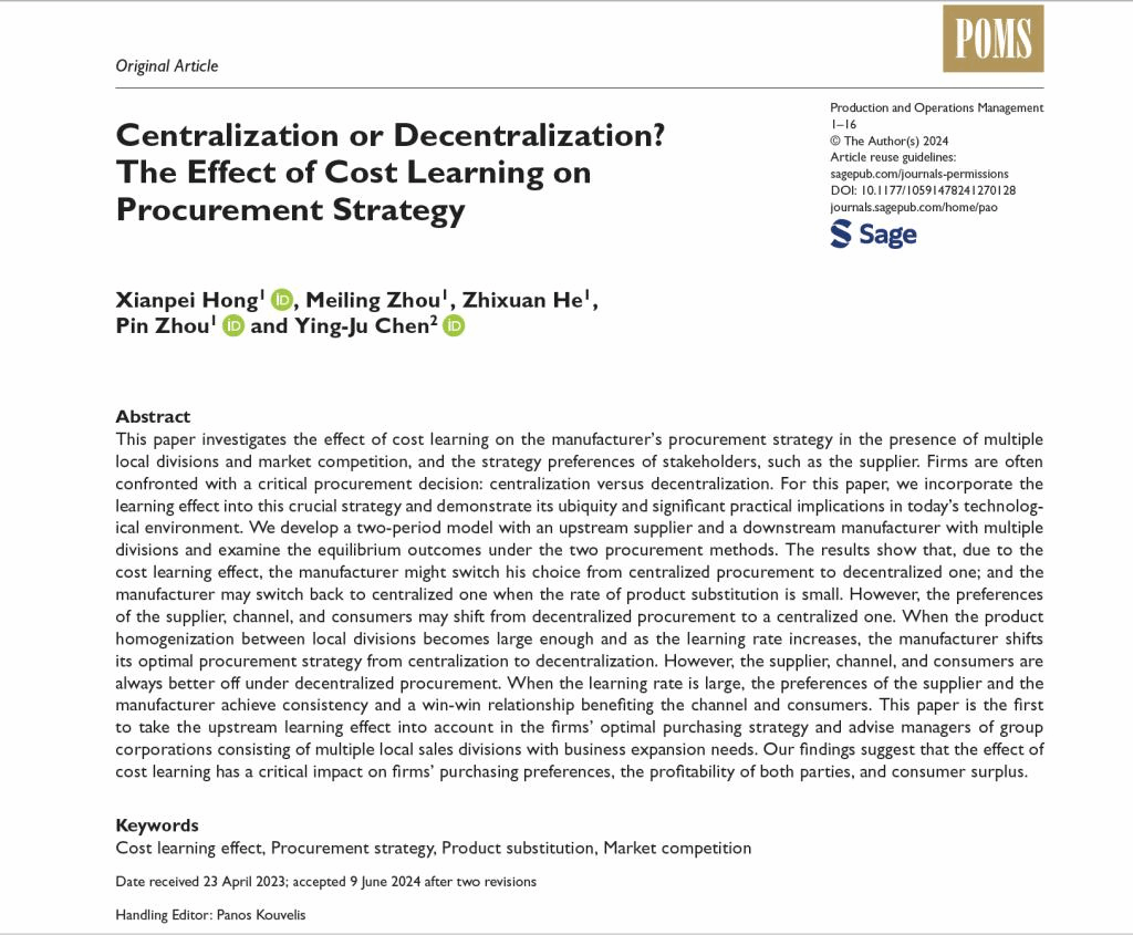 近日,beat365官网洪宪培教授、周品副教授、博士生周美伶、硕士生何芷璇与香港科技大学陈滢儒教授合作撰写的论文“Centralization or Decentralization? The Effect of Cost Learning on Procurement Strategy”发表于国际顶级管理学期刊UTD 24期刊Production and Operations Management。该研究得到了国家自然科学基金、香港研究资助局的资助。