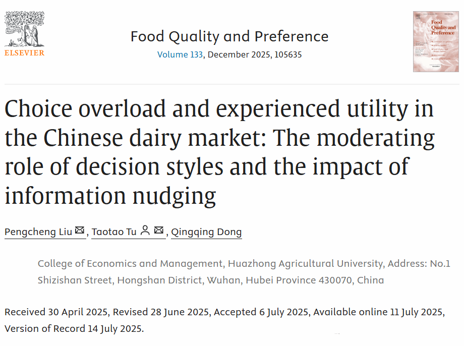 beat365中文唯一官网经济学系柳鹏程老师(一作)和涂涛涛老师(通讯)团队合作论文“Choice Overload and Experienced Utility in the Chinese Dairy Market: The Moderating Role of Decision Styles and the Impact of Information Nudging”发表于Food Quality and Preference杂志。该杂志是一本以FOOD SCIENCE & TECHNOLOGY为研究方向的国际顶尖学术杂志,由Elsevier Ltd出版,为中科院一区Top期刊。