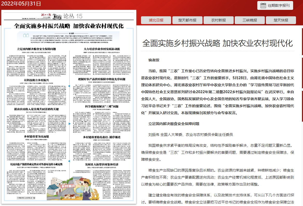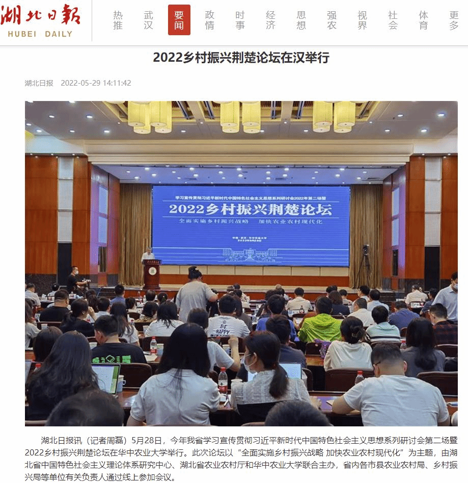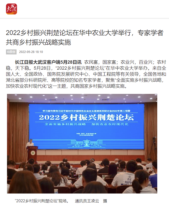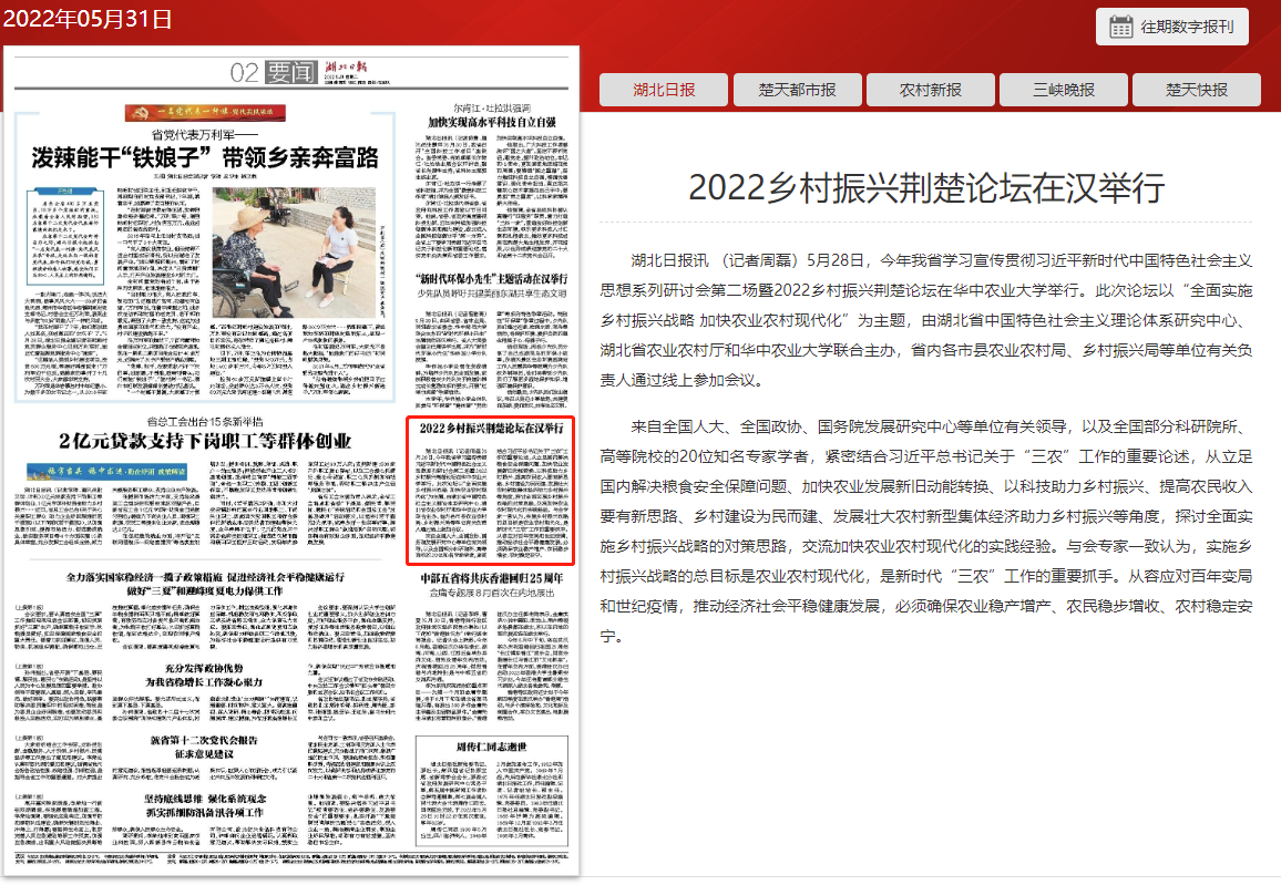 《湖北日报》及《湖北日报》(客户端)以“2022乡村振兴荆楚论坛在汉举行”为题,对论坛开展情况进行了报道。报道指出,与会专家一致认为,实施乡村振兴战略的总目标是农业农村现代化,是新时代“三农”工作的重要抓手。从容应对百年变局和世纪疫情,推动经济社会平稳健康发展,必须确保农业稳产增产、农民稳步增收、农村稳定安宁。