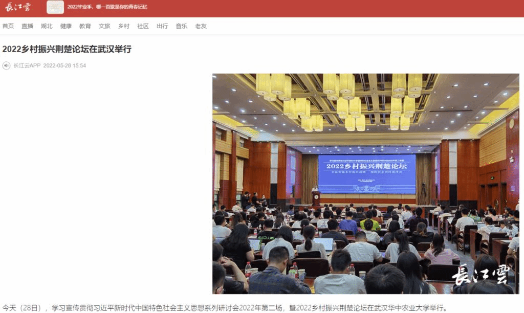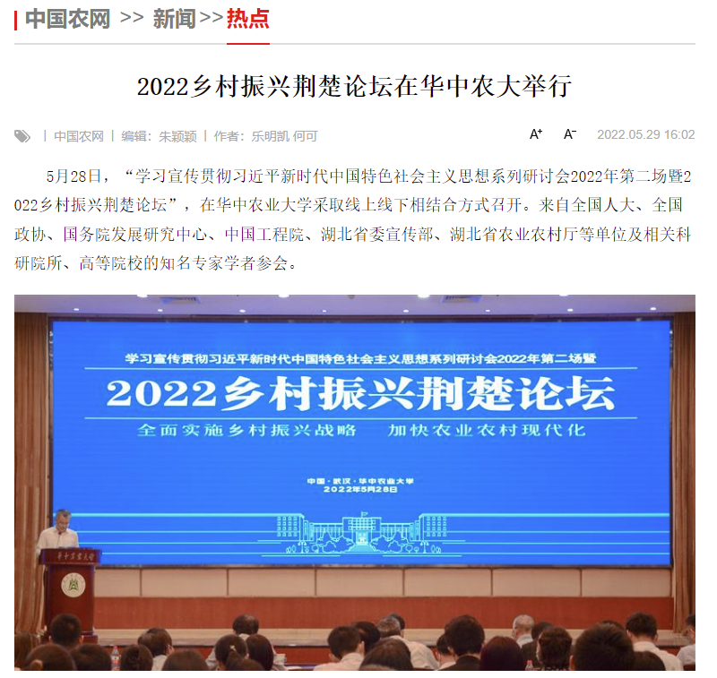 29日,中国农网以“2022乡村振兴荆楚论坛在华中农大举行”为题,对论坛开展情况进行了报道。报道指出,与会专家们探讨全面实施乡村振兴战略的对策思路,交流加快农业农村现代化的实践经验,对守底线、抓重点、推进乡村振兴起到积极作用。