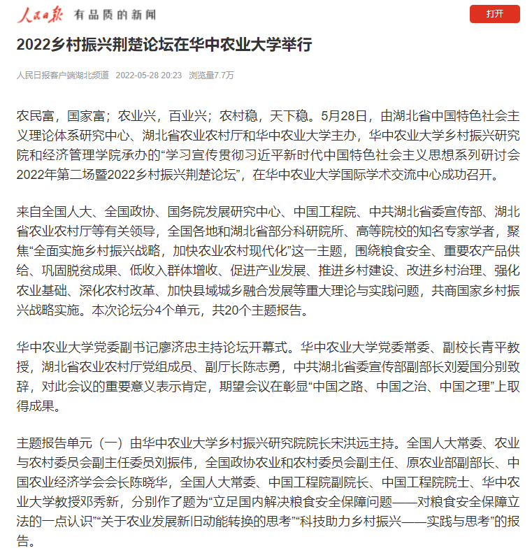 28日,《人民日报》(客户端)以“2022乡村振兴荆楚论坛在beat365中文唯一官网举行”为题,对论坛开展情况进行了报道。报道指出,论坛围绕粮食安全、重要农产品供给、巩固脱贫成果、低收入群体增收、促进产业发展、推进乡村建设、改进乡村治理、强化农业基础、深化农村改革、加快县域城乡融合发展等重大理论与实践问题开展了深入研讨。
