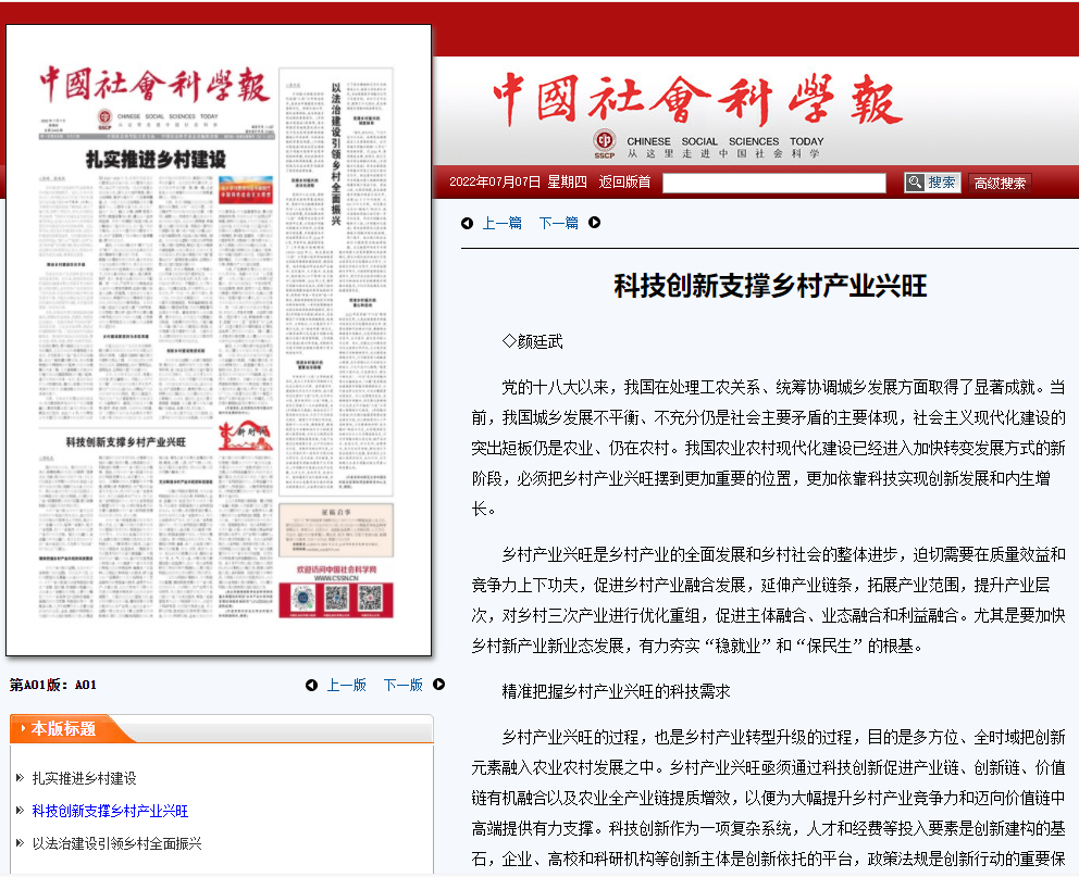 【中国社会科学报】科技创新支撑乡村产业兴旺