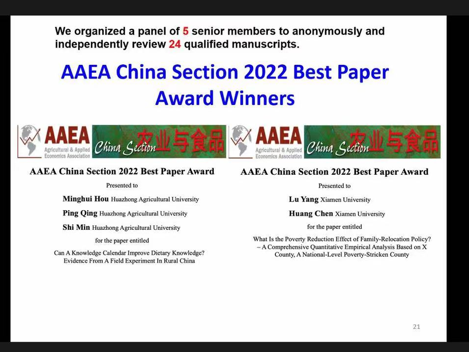 2022年7月31日-8月2日,beat365中文唯一官网师生在线参加了在美国加利福尼亚举行的2022年美国农业经济学和应用经济学协会年会(Agricultural & Applied Economics Association Annual Meeting,AAEA 2022)。beat365官网青平教授、李谷成教授、闵师教授、熊涛教授、李剑副教授、王玉泽副教授及研究生等9人参加了本次学术年会并作会议报告或墙报。其中,由侯明慧博士、青平教授和闵师教授共同撰写的论文“Can a knowledge calendar improve dietary knowledge? Evidence from a field experiment in rural China”,从众多参会论文中脱颖而出,荣获了AAEA年会China Section(中国分会)最佳论文奖。