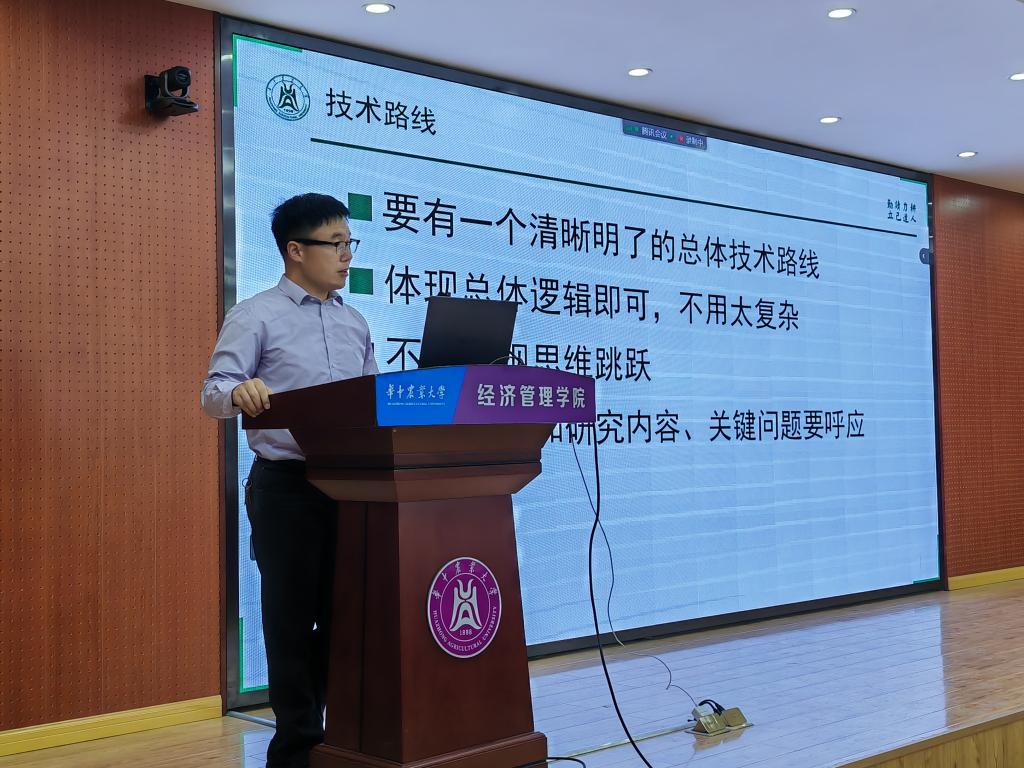 经管学院院长李谷成对此次会议作总结发言。他鼓励教师们积极申报国家基金项目,并告诫各位教师能够把握住时间节点,“功夫要下在平时”,享受学术的过程,切忌临时抱佛脚,争取来年能够申报成功,取得好成绩。副院长颜廷武则用“四个一”来勉励各位教师,希望大家在基金申报中能够以一往无前的精神、一如既往的投入、一字千金的打磨,取得一鸣惊人的效果。