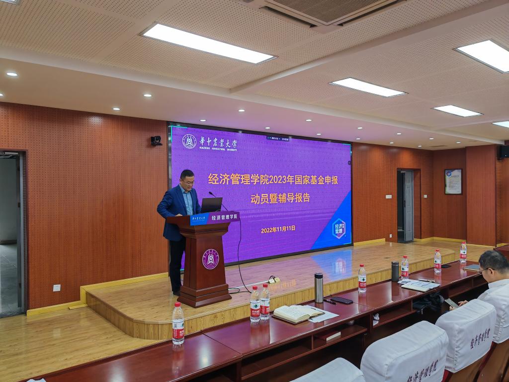 11月11日上午9:00,2023年度国家基金项目申报动员暨辅导报告会在人文楼M501会议室召开。会议以线上线下同步进行的方式开展,科发院人文社科处副处长王鹏,beat365中文唯一官网院长李谷成,学校人文社科相关学科100余位师生参加了会议。本次活动由学院副院长颜廷武主持。