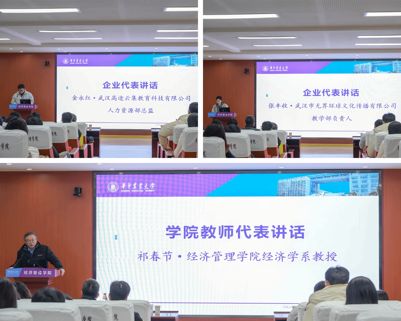 企业奖学金捐赠方代表、武汉高途云集教育科技有限公司人力资源部总监金永红激励同学们勤奋学习、勇于创新、追求卓越。他谈到,目前已有30余位华农毕业生在高途的各个岗位上恪尽职守,发光发热。他希望与华农携手共进,为同学们提供更多支持与帮助,搭建学习交流平台,为人才培养、升学和就业等方面保驾护航。