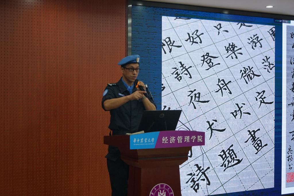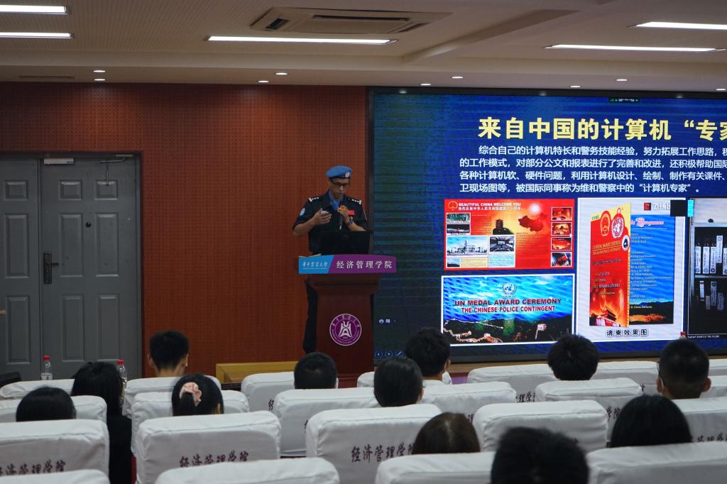 “努力了,才不会有遗憾!”胡连军以激情飞扬的利比里亚维和岁月为时间纵轴,以联合国维和选拔培训及行动为闪亮坐标,向大家分享了自己先后2次赴利比里亚执行联合国维和任务的经历。随后,他从治安状况、交通状况等方面将利比里亚和中国相对比,告诫同学们要脚踏实地、努力奋斗,珍惜眼前来之不易的幸福生活。“维和一小步,人生一大步;永远不停步,走好每一步。”胡连军勉励同学们要坚定理想信念,以担当彰显初心,用实干践行使命。