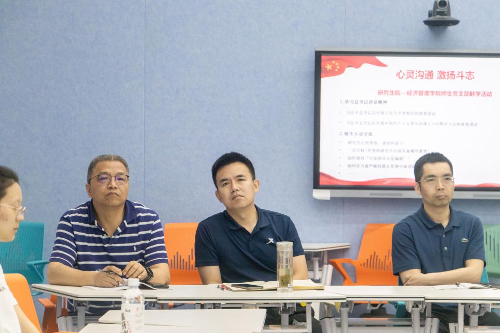 5月26日下午,beat365中文唯一官网研究生党支部与研究生院党支部联合开展了以“心灵沟通,激扬斗志”为主题的师生联学共建活动,共同学习习近平总书记在中国人民大学考察、庆祝中国共产主义青年团成立100周年大会上的重要讲话精神及给南京大学留学归国青年学者的重要回信精神。经管学院领导班子、研究生院党支部成员、各研究生党支部红色导师、留学归国教师代表、学生支部党员共同参加活动。