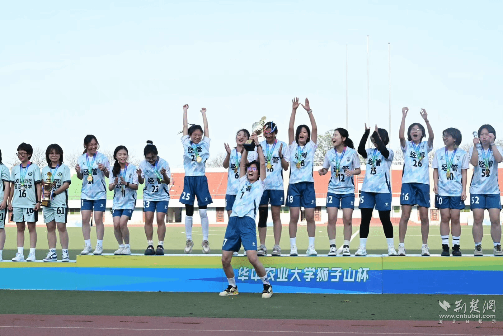 加入经管院队和校女足之初,我只是怀揣着对足球的好奇。但两支劲旅的竞技氛围很快点燃了我的斗志。2023年以来,经管女足蝉联学校“新生杯”“狮子山杯”双冠,校女足队更斩获2024年11人制省赛冠军和2025年5人制省赛亚军。这些荣誉背后,是每周五天雷打不动的训练:从脚尖触球的生涩到射门力道的精准,从防守卡位的犹豫到战术执行的果断,每一分进步都是汗水浸润的勋章。